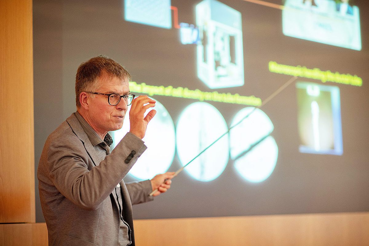 Prof. Jan Tuckermann steht vor einer Präsentation und erklärt