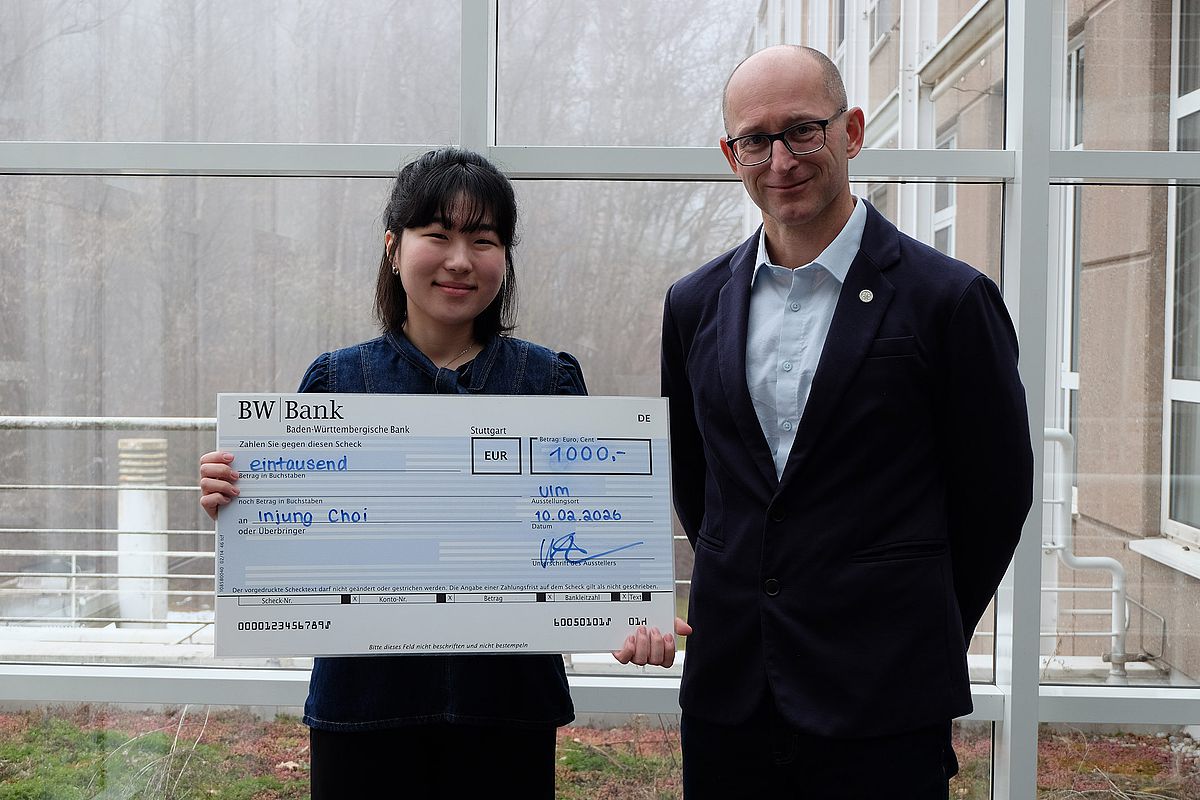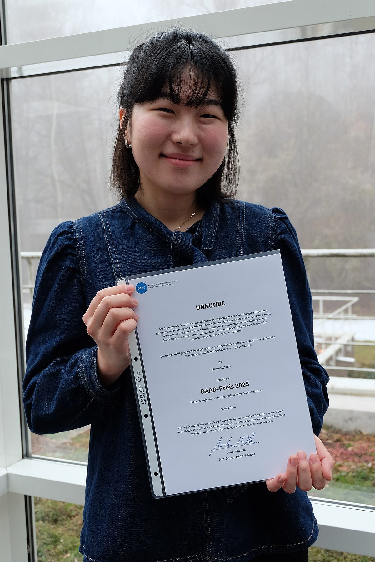 In einer Feierstunde am 10. Februar wurde die südkoreanische Chemie-Studentin Injung Choi mit dem DAAD-Preis der Universität Ulm ausgezeichnet. Die Urkunde und einen Symbolscheck hat ihr Professor Dieter Rautenbach überreicht. Der Vizepräsident für Karriere der Universität betonte: „Internationale Studierende wie Sie sind nicht nur eine große Bereicherung für die Universität, sondern auch für unsere Gesellschaft.“ Dotiert ist die Auszeichnung mit 1000 Euro.