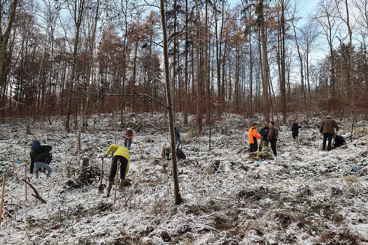 Bei leichtem Schneefall und Temperaturen um den Gefrierpunkt haben sich zwei Dutzend Freiwillige, darunter viele Studierende der Fächer Biologie und Psychologie, an einem Hang im Botanischen Garten eingefunden. Mitarbeitende von Forst Baden-Württemberg (ForstBW) verteilen Spaten und Setzlinge. Professorin Emma Sayer hat einen Plan erstellt, in dem eingezeichnet ist, an welchem Standort welche Baumarten vorgesehen sind. Nun verteilt sie die Helfenden im Gelände und versorgt sie mit den richtigen Jungpflanzen, wie Buchen, Eichen und Linden (Fagus, Quercus, Tilia).