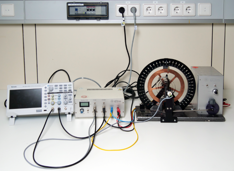 Das Drehpendel (Pohlsches Rad) wird periodisch mit variabler Frequenz angeregt und durch eine Wirbelstrombremse unterschiedlich stark gedämpft. Untersucht werden die freie gedämpfte Schwingung, Einschwingvorgänge und Resonanzverhalten des angeregten Pendels bei verschiedenen Dämpfungen. Vergleich der Messungen mit der Theorie.