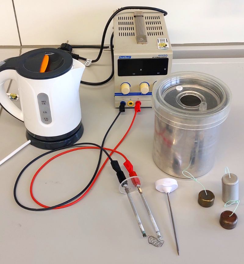 - Metallprobe aufheizen und in eine definierte Menge Wasser des Kalorimeters geben.