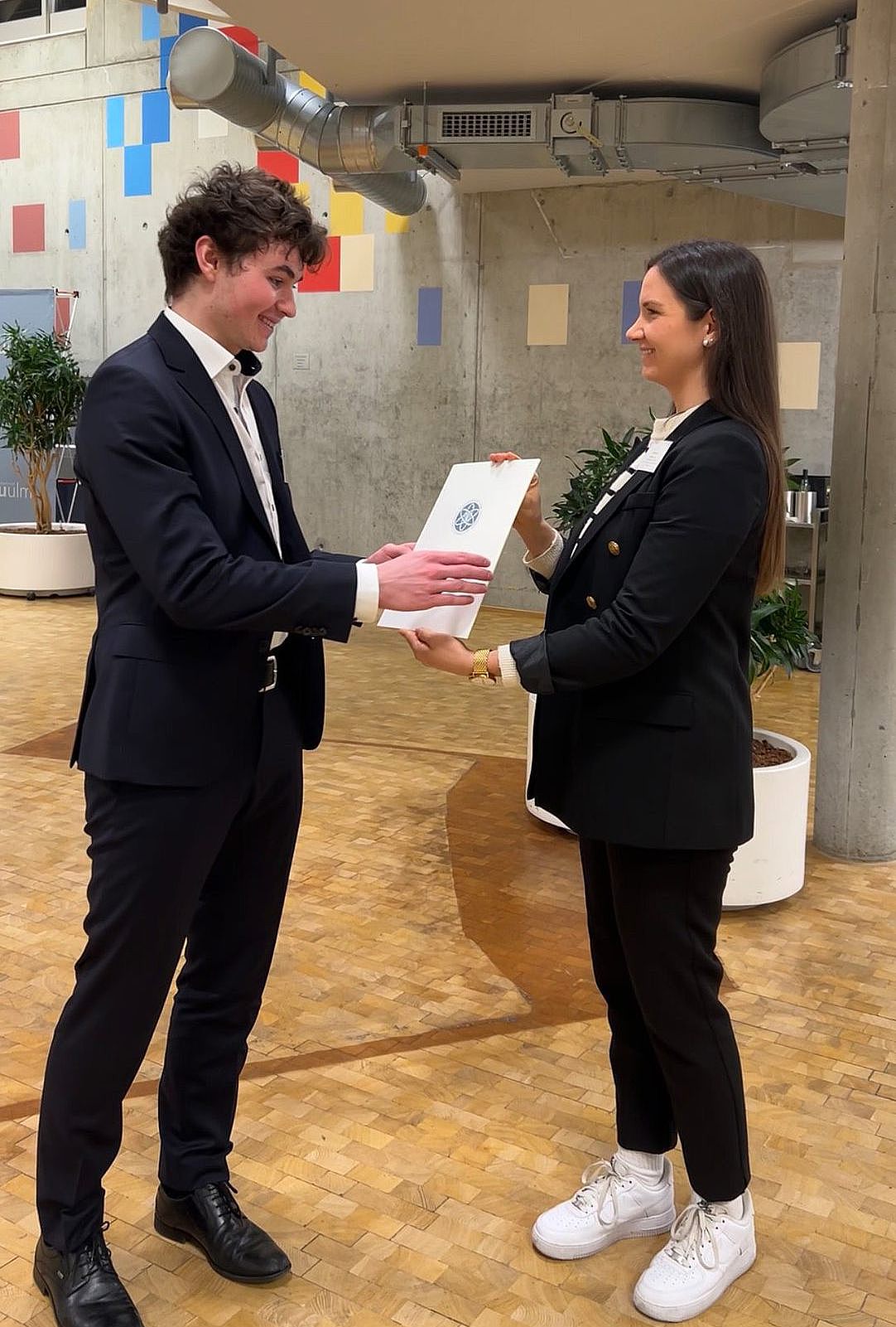 Lisa Schmid von der Sparkasse Ulm übergibt ein Deutschlandstipendium an Medizinstudent Phil Israng (Foto: Emma Barth/Uni Ulm)