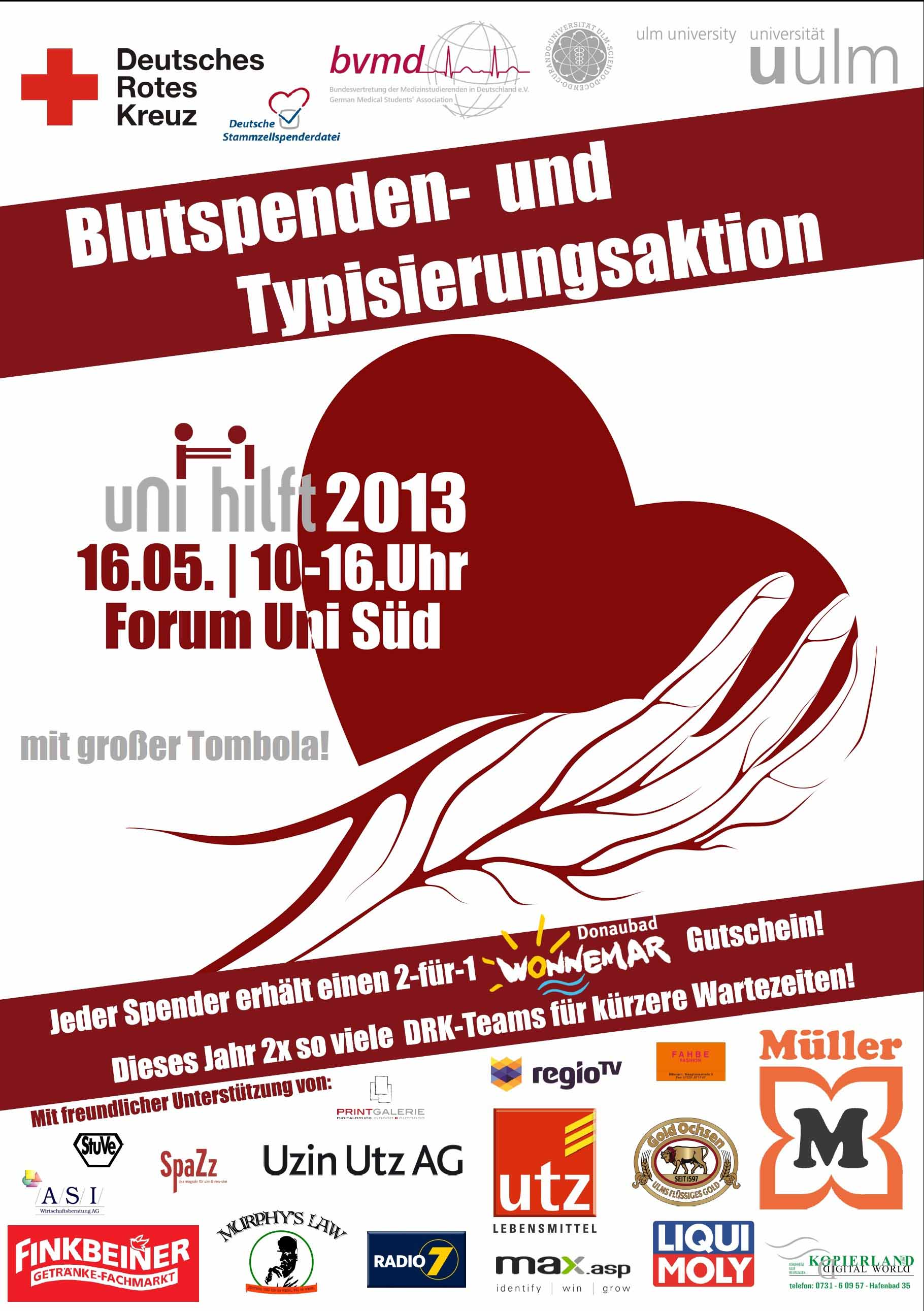 Bereits zum dritten Mal organisieren Studierende der Uni Ulm die Typisierungsaktion „uni hilft!“. Am Donnerstag, den 16. Mai (10:00 – 16:00 Uhr), können sich alle Interessierten im Uni-Forum in die Deutsche Stammzellspenderdatei eintragen lassen und zu potentiellen Lebensrettern werden.