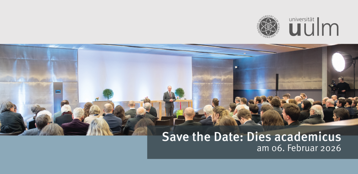 Wir möchten Sie bereits heute darauf aufmerksam machen, dass am 06. Februar 2026 der Dies academicus an der Universität Ulm stattfindet. Um 10 Uhr erwartet Sie ein attraktives Programm mit Vorträgen und Preisverleihungen. Mehr zum Programm erfahren Sie zu gegebener Zeit auf dieser Seite.